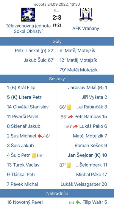 Vstup do druhé půle se nám bohužel opět nevydařil. Nedařilo se nám zachytit tempo domácích, kteří nechtěli na domácí půdě ztratit body. V 67. minutě po skrumáži ve vápně se povedlo Šulcovi dostat míč za záda výborně chytajícího Jardy Mikše a stav byl nerozhodný 2:2. Snažili jsme se zabojovat ze všech sil a obrat dosud neporažené Obříství o body, což se nám vydařilo v 79. minutě, kdy se po vychytané šanci Honzy Švejcara míč odrazil k Matějovi, který se ze složité pozice nemýlil a završil tak svůj hattrick![]()